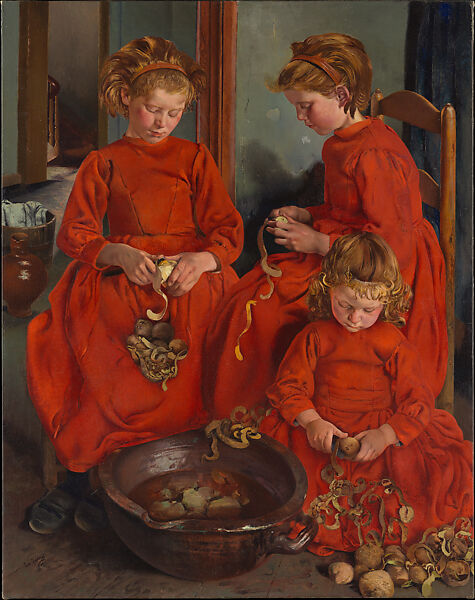 This work of art is currently on loan to the museum.In the 1890s Frederic’s paintings of impoverished workers and peasants in his native Belgium were celebrated for their forthrightness and arresting intensity. Here, the humdrum activity of peeling potatoes is vivified by the girls’ bright red dresses and gleaming red-gold and blond hair. Their downcast eyes and serene expressions recall representations of the young Virgin Mary in sixteenth-century Flemish art, which Frederic greatly admired. Nothing is known of the sitters beyond the painting’s title, which identifies them as sisters; the two eldest are so uncannily alike that they appear to be twins.