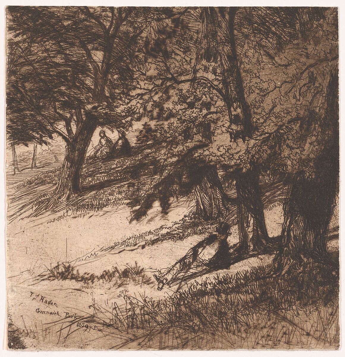 State I. The scene very weakly etched and there is extensive but light foul-biting. With the inscription by Whistler F.S. Haden, Greenwich Park, 1859 (E,1.1)."