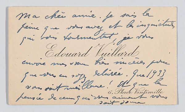 F. C. Schang donated 64 artists’ calling cards to The Met between 1977 and 1989. The calling cards are housed in an album that also includes Schang’s collection of stamps and other related ephemera. Calling cards derived from a custom, originating in England, in which messages were inscribed on the backs of playing cards. Cards made for the express purpose of sharing hand-written messages were manufactured beginning in the eighteenth century; by the early-nineteenth century, calling cards had become a popular means for sending well wishes, holiday greetings, condolences, and messages of courtship. On this calling card, Vuillard consoles the recipient and wishes for 1933 to bring better times to him or her.