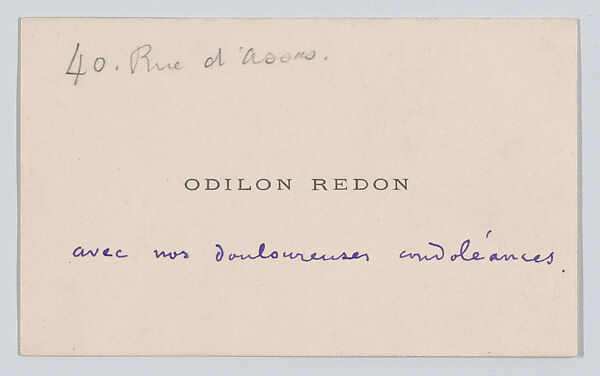F. C. Schang donated 64 artists’ calling cards to The Met between 1977 and 1989. The calling cards are housed in an album that also includes Schang’s collection of stamps and other related ephemera. Calling cards derived from a custom, originating in England, in which messages were inscribed on the backs of playing cards. Cards made for the express purpose of sharing hand-written messages were manufactured beginning in the eighteenth century; by the early-nineteenth century, calling cards had become a popular means for sending well wishes, holiday greetings, condolences, and messages of courtship. On this calling card, Redon sends his condolences to the recipient.