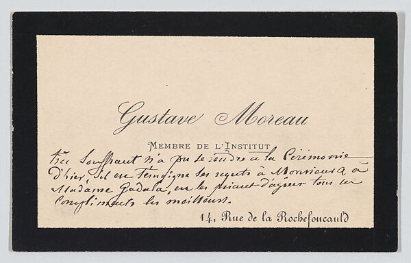 F. C. Schang donated 64 artists’ calling cards to The Met between 1977 and 1989. The calling cards are housed in an album that also includes Schang’s collection of stamps and other related ephemera. Calling cards derived from a custom, originating in England, in which messages were inscribed on the backs of playing cards. Cards made for the express purpose of sharing hand-written messages were manufactured beginning in the eighteenth century; by the early-nineteenth century, calling cards had become a popular means for sending well wishes, holiday greetings, condolences, and messages of courtship.