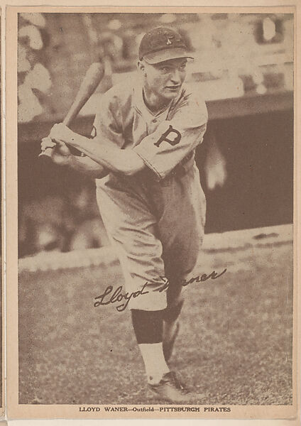 Lloyd Waner, Outfield, Pittsburgh Pirates, Baseball trade cards (W554). Unnumbered. Brown-toned, heavy stock, oversized card. Full-length action-posed player. Facsimile signature printed within image. Player's name, position and team printed at bottom white border. Back is blank. 18 cards in set.