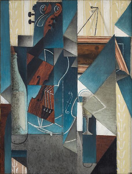 Violin and Engraving represents a rare example of Gris’s initial experiments with papiers collés before his breakthrough year in 1914. Gris left Madrid for Paris in 1906 and settled in the Bateau-Lavoir, a building in the Montmartre district that served as home and studio to several artists, including Pablo Picasso. There Gris witnessed the development of Cubism, while he supported himself initially as an illustrator. By 1911, he had begun to make a name for himself as a Cubist innovator, and a year later, developed his own signature canvases that were organized into grids of shifting vertical bands that would soon become diagonal or fan shaped. Such structures allowed him to produce taut but dynamic examinations of subjects from multiple positions. In early works of 1912 and 1913 he incorporated areas of solid color or textured brushwork with others filled with faux patterns (wood or wallpaper, for example)—what would, in later canvases, typically be filled with papier collé (pasted paper). While Picasso and Georges Braque had invented the papier collé technique, it was Gris who first exhibited a composition (The Washstand, 1912, private collection), at the 1912 Section d’Or exhibition at the Galerie la Boétie, Paris, where he received great critical attention for the "curious originality of [his] imagination."