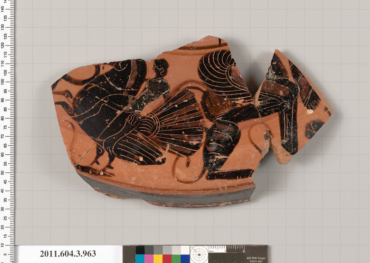 At the top, tip of one ray; below, a line of black glaze and a thin line of red glaze; draped youth to left, riding a hippalectryon ("cock horse"); part of a sphinx to right, looking to left; part of the wing of a siren to right; below the wing, a rosette; the overhang of the lid is black glazed; the resting surface is unglazed; the underside is glazed