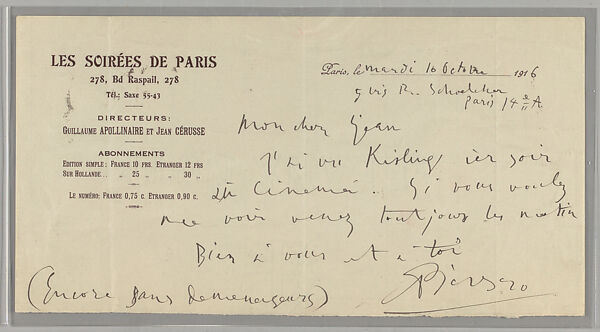• Title: Documents concerning Parade: [Letter from Picasso to Cocteau]