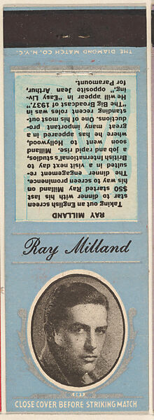 - Title: Ray Milland from Movie Stars Match Cover design series (U21) issued by Diamond Match Company