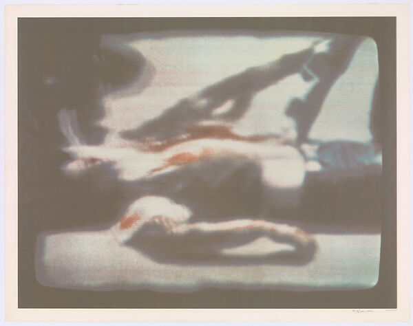Prints were an essential part of Richard Hamilton's oeuvre. They allowed him to experiment with form and technique by combining methods and creating new processes, as well as to allude to a variety of cultural references ranging from art history to popular culture. The image for "Kent State" was pulled from the television, a source Hamilton refers to with the print's rounded edges of the corners and the black outline. Hamilton has stated "It had been on my mind that there might be a subject staring me in the face from the TV screen." Equipped with a camera, he watched television for a week in May 1970 to realize this project. During this period the tragedy at Kent State occurred when the National Guard opened fire on students protesting the Vietnam War. Hamilton pulled the image of a wounded Ohio student in the print from the BBC news, which broadcast coverage of the carnage. About the image, Hamilton stated "Every night I sat watching [TV] with a shutter release in my hand... In the middle of the week the shooting of students by National Guardsmen occurred at Kent State University. This tragic event produced the most powerful images that emerged from the camera, yet I felt a reluctance to use any of them. It was too terrible an incident in American history to submit to arty treatment. Yet there it was in my hand, by chance--I didn't really choose the subject, it offered itself. It seemed right, too, that art could help to keep the shame in our minds; the wide distribution of a large edition print might be the strongest indictment I could make." [Richard Hamilton: Word and Image: Prints 1963-2007]
