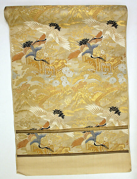 The maru-obi (round sash) is the most formal type of this accessory, typically reserved for weddings and other special occasions. Such sashes are woven as a single piece of fabric that is then lined, folded lengthwise, and sewn shut to allow both sides to display the same luxurious pattern. They are traditionally crafted from brocaded silk enriched with gold and silver threads. Admired for their sumptuous appearance, maru-obi were especially popular during the Meiji and Taishō periods. This unfolded example is embellished with designs that would ensure a happy marriage.