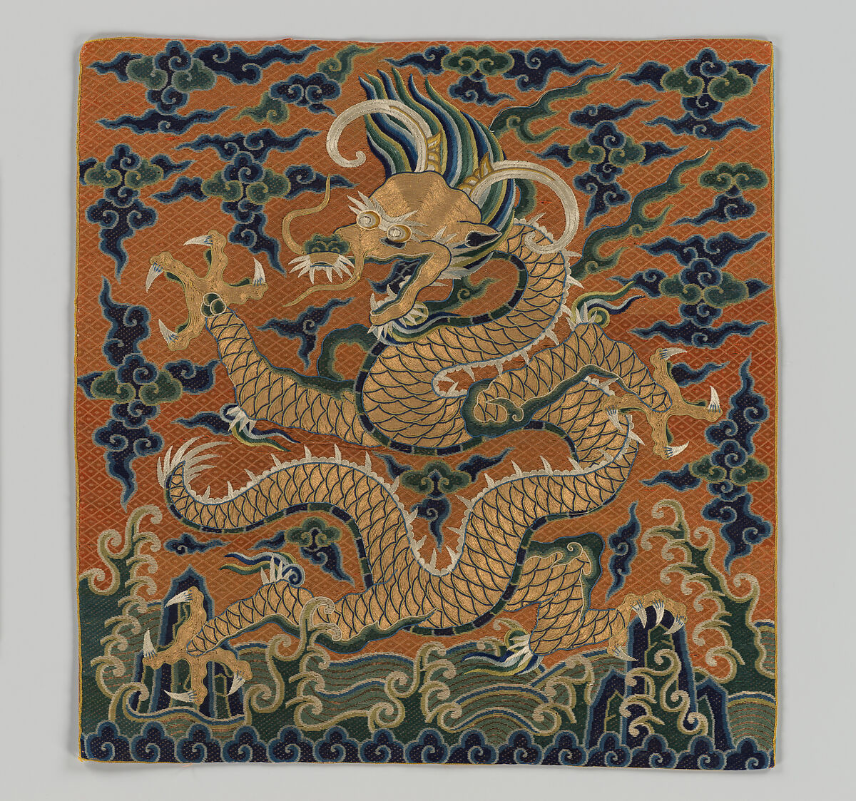 This exquisite embroidery depicting a dragon with prominent ox horns is a rare example of a ceremonial Ming dynasty rank badge conferred by the emperor on high officials on special occasions such as sacrificial ceremonies at the imperial mausoleums, grand inspections of the army, or delivering a Confucian lecture to the emperor.