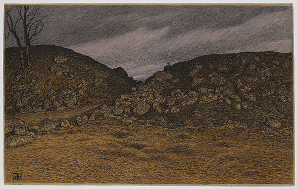 Created in 1902, following Hallström’s training at the Royal Academy of Fine Arts in Stockholm but before his period of further study in Paris and travels through other parts of Europe and Russia, this evocative drawing is an exceptional example of the artist’s early landscapes. Two earthen mounds, strewn with rocks, rise against a dark, stormy sky, its cool purple tones contrasting with the warm yellows in the terrain below. Most likely Viking graves (based on the Royal Mounds at Uppsala), these mounds were of enormous interest to Hallström, who incorporated them into his work on multiple occasions and who would ultimately dedicate himself to the depiction and preservation of Viking history and legends on the Swedish island of Björkö.