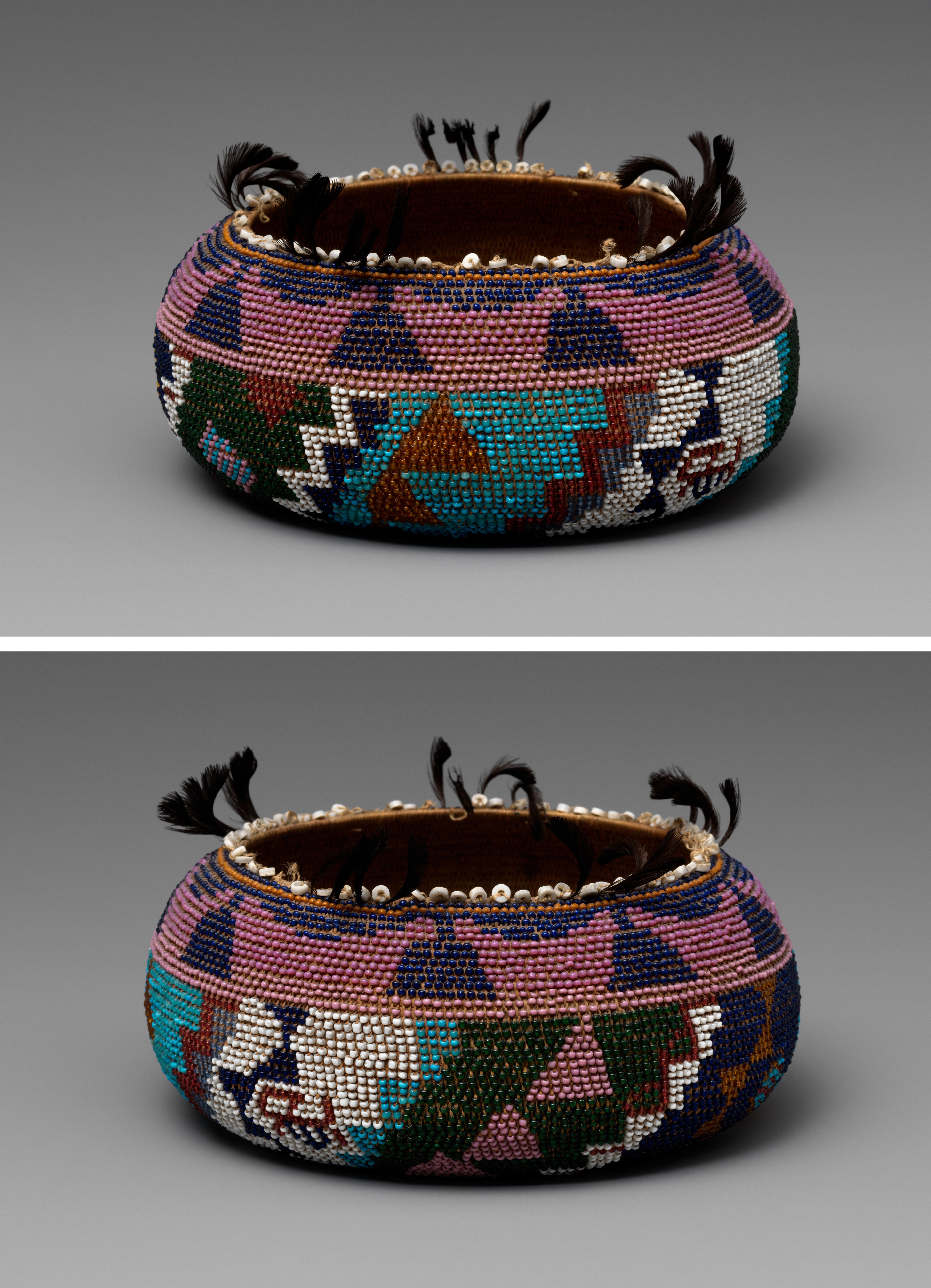 Sometimes we can nearly solve a provenance mystery, but a firm conclusion remains out of reach; this is the case for a small beaded Native American California basket in The Met collection. The basket in question dates from about the 1880s to 1910 and is nearly covered in tiny, jewel-like glass beads sewn onto the surface with almost invisible stitches in alternating colors and patterns. The bottom, which few would see from the basket’s usual placement on a table or shelf, is almost entirely covered with beads; only a small circle at the start of the basket is uncovered. Even there, the artist wove in the four arms of a tiny spiral, decorating the very spot least likely to be seen by a viewer.