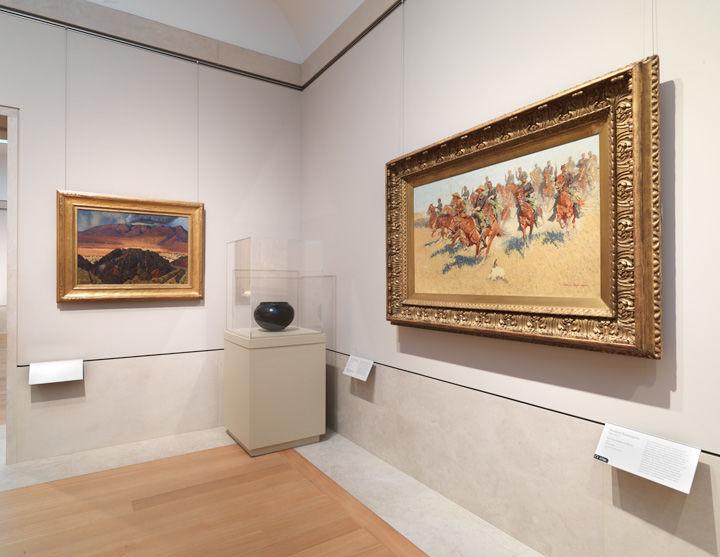 View of Maria Martinez's olla installed in gallery 765 between Ernest Blumenschein's Taos Valley, New Mexico and Frederic Remington's On the Southern Plains