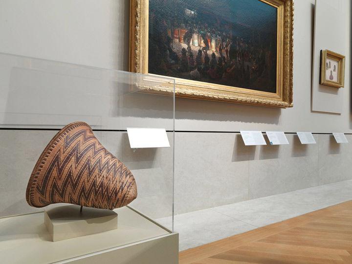 View of gallery 760 showing Jules Tavernier's Dance in a Subterranean Roundhouse at Clear Lake, California and the Pomo basket