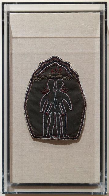 The exceedingly rare early 19th-century pouch was fabricated from wool that resembles smoke-dyed buckskin, suggesting the hybrid nature of Native production during this period—blending European materials with indigenous imagery. Its innovative ornament is executed in beaded seed-glass embroidery. On the front is a conventional floral decoration and, on the back, the raised flap forms a composition that represents the sacred conjoined twins—key figures in the legends of New York's Iroquois, or Haudenosaunee, the historically powerful Native American confederacy of Mohawk, Oneida, Onondaga, Cayuga, Seneca, and, later, Tuscarora nations.