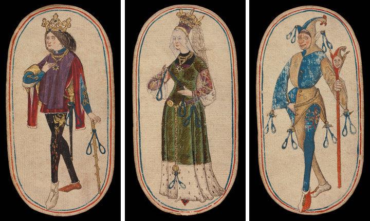 The elaborate, magnificent costumes of the kings and queens, which display abundant amounts of ermine and bejeweled trim, gold embroidery, and substantial gold necklaces with gem-studded pendants, are perhaps the most striking aspect of the face cards. The knaves wear the less opulent costumes appropriate to their varying stations: jester, herald, foot soldier, and huntsman. Rather than as a record of some specific time or event, the royal figures in all their sartorial splendor function as fashion plates representing the middle and later decades of the 15th century.