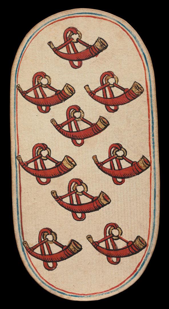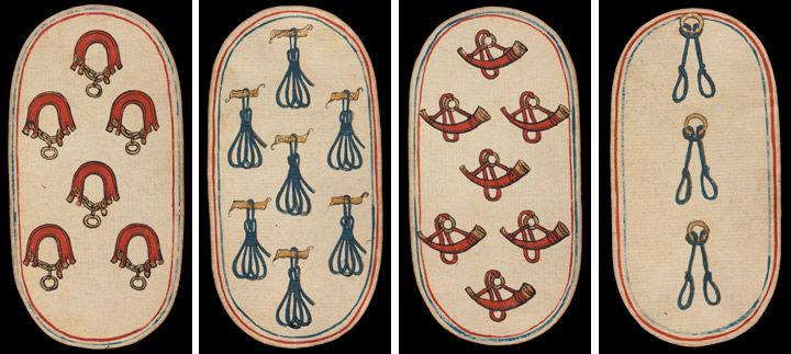 6 of Collars, 7 of Tethers, 7 of Horns, and 3 of Nooses, from The Cloisters Playing Cards, ca. 1475–80. Made in Burgundian territories. South Netherlandish. Paper (four layers of pasteboard) with pen and ink, opaque paint, glazes, and applied silver and gold; 5 3/16 x 2 3/4 in. (13.2 x 7 cm); The Metropolitan Museum of Art, New York, The Cloisters Collection, 1983 (1983.515.1–.52)