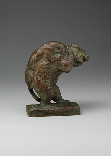 Deming based "The Fight" on the firsthand description by a Native American friend who had witnessed a brutal struggle between a mountain lion and a grizzly bear. The artist recorded the brief, intense moment when the massive bear bows under the agonizing impact of the clawing, biting animal. Deming, who frequently traveled to the American West, was fascinated by bears; his studio in New York’s MacDougall Alley was called the Lodge of the Eight Bears, after the name the Blackfoot had given him.