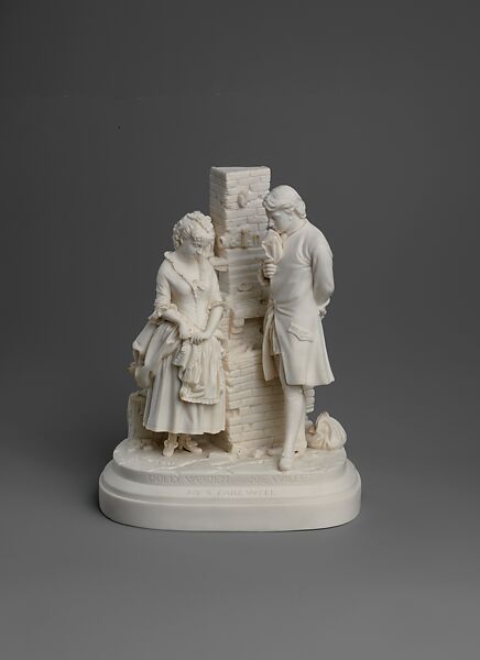 From 1870 until his departure for Italy in 1874, French modeled twenty-five decorative sculptures from which thousands of parian and painted-plaster reproductions were made and sold for a few dollars apiece. His decision to create small works for a primarily commercial end was influenced by the success of the plaster statuettes of John Rogers known as Rogers Groups. Several of French's efforts were inspired by the writings of Charles Dickens. "Joe's Farewell," from a passage in "Barnaby Rudge" (1841), reflects Joe Willet's trials and tribulations in his relationship with Dolly Varden. French closely followed the narrative in composing his group as Joe, smitten with Dolly, bids her farewell by the forge in her father's workshop. How many parian and painted-plaster reproductions of "Joe's Farewell" were produced has not been determined, but the group is one of French's best known early works.