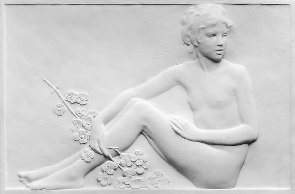 Grimes designed "Girls Singing," also known as "Spring, North and South," and its companion piece (44.44.2) as a pair to be placed back to back on either side of a fountain. Classicizing in spirit, each panel depicts an adolescent female nude shown seated, looking back over her shoulder nearest the viewer, and when the panels are installed together, looking at each other. This figure holds a dogwood branch, while the girls in the other panel (44.44.2) holds a sanxian, a Chinese long-neck lute.