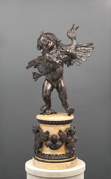 MacMonnies’s best groups have an exuberance resulting from his affinity for contemporary sculpture in France, where he spent much of his career. Modeled in Paris, “Boy and Duck” depicts a laughing boy delighted at having captured a prize duck. When the work is installed as a fountain, the duck and ducklings spout water from their open beaks, and the implied noise and confusion of the moment are vividly evoked. The theme of a nude boy struggling with a feisty animal dates back to ancient works of art, some of which MacMonnies had admired on a trip to Italy in 1894. The tradition was revived in Italian Renaissance art and carried further in nineteenth-century French and American sculpture.