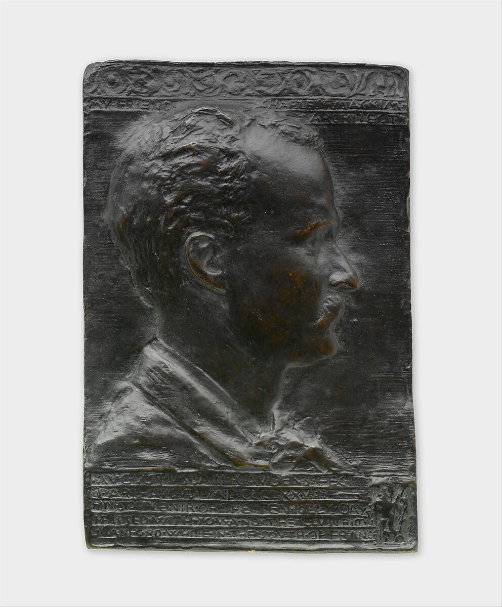McKim (1847-1909) sat for his portrait in Paris in 1878, a year before the formation of McKim, Mead & White, which became the most influential architectural firm of America’s Gilded Age. McKim and Saint-Gaudens met in 1875, brought together by "a devouring love for ice cream," and remained close professional colleagues for three decades. Here McKim’s features are truthfully rendered in profile, with a receding hairline, prominent jaw, and serious mien. The foliate scroll at the top and the group of acanthus leaves at the lower right refer to McKim’s passion for the classical as his architectural touchstone. The affectionate inscriptions in filleted bands at top and bottom celebrate "my friend Mac [sic] Kim" and the "jolly days" they spent together with Stanford White in the south of France.