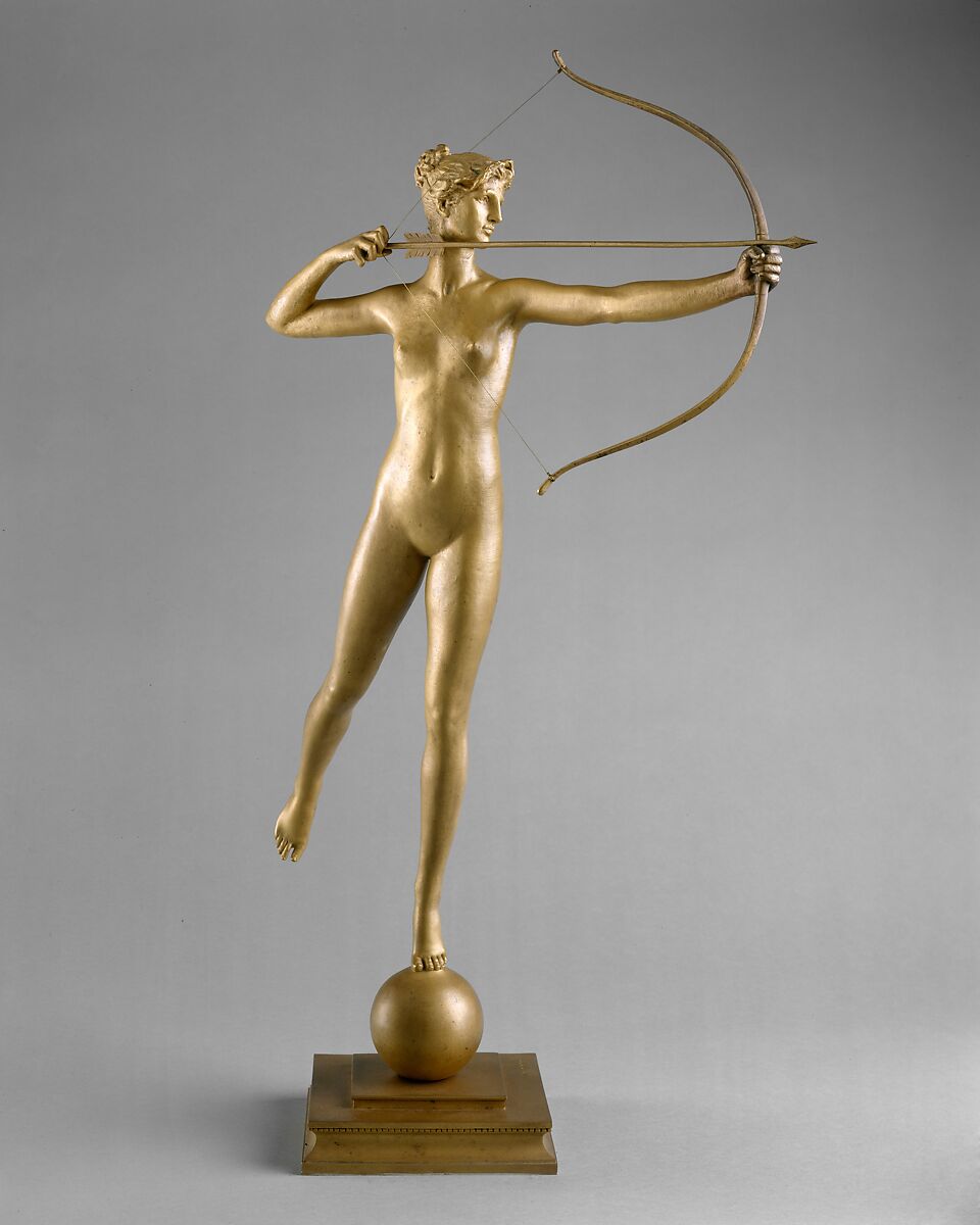 From its perch atop Madison Square Garden’s tower, the resplendent gilded Diana enjoyed iconic status on the New York City skyline from 1892 to 1925. An earlier, larger version was displayed on top of the Agriculture Building at the Chicago fair. Saint-Gaudens capitalized on the sculpture’s fame by issuing variant reductions of the lithe goddess about to release her arrow. The lustrous patina of this smaller cast was achieved by electroplating a mixture of gold, copper, and zinc to the bronze surface.