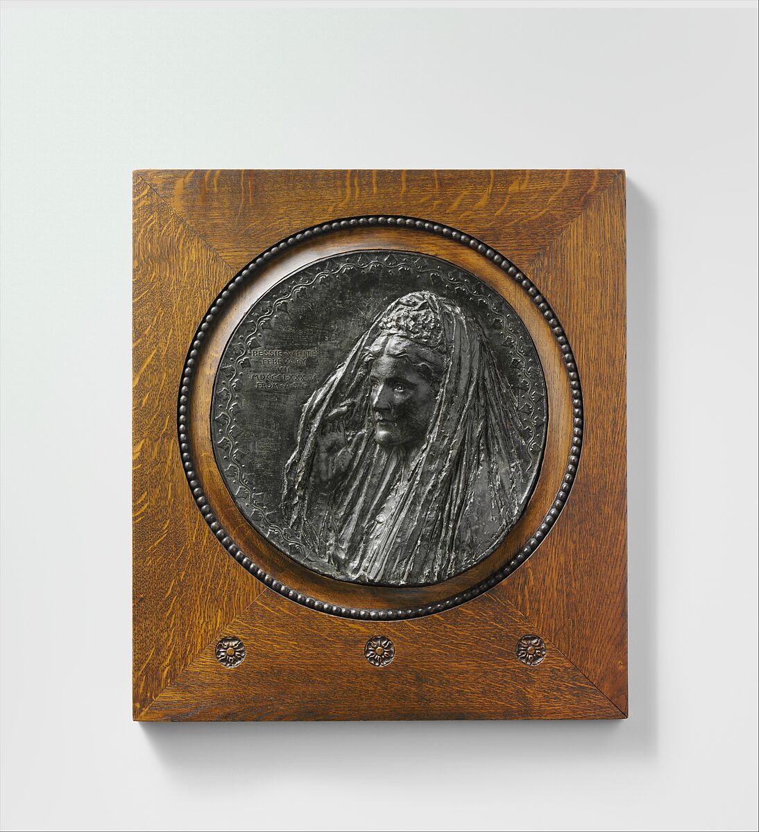 Saint-Gaudens frequently experimented with the size, format, and medium of his works, often driven to further refine completed compositions. The sculptor revised the original marble rectangular portrait of Bessie Springs Smith White (1862-1950) (1976.388) to a bust-length tondo format, relocating the inscription and adding an ivy-vine border alluding to affection and friendship. This bronze cast was in fact a gift of friendship to Mary Lawrence Tonetti, who was one of Saint-Gaudens’s studio assistants during the 1890s and a distant cousin of the sitter.