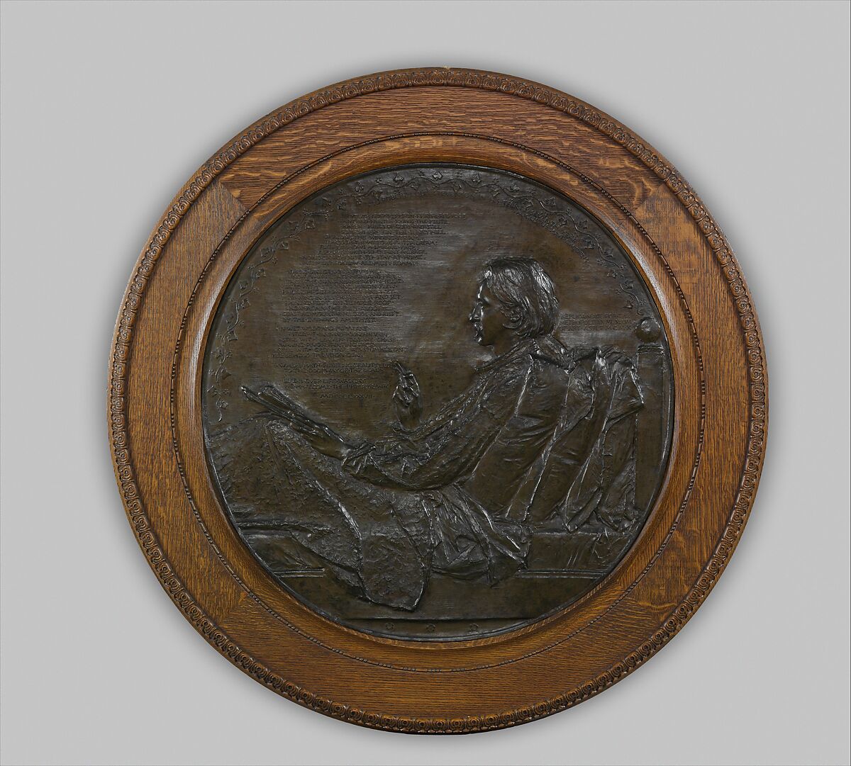 Impressed by Robert Louis Stevenson’s collection of stories New Arabian Nights (1882), Saint-Gaudens told their mutual friend, Will Low, that he would be honored to model a portrait if the writer were ever to come to the United States. The opportunity presented itself in 1887–88, when Stevenson (1850–1894) sat for the sculptor in New York and later in Manasquan, New Jersey. Stevenson, suffering from tuberculosis, is shown writing in bed, as was his custom. The lengthy inscription is a poem by Stevenson dedicated to Low and published in 1887. The portrait became Saint-Gaudens’s most popular relief and was produced in three diameters (this is the largest size) as well as in rectangular variants.