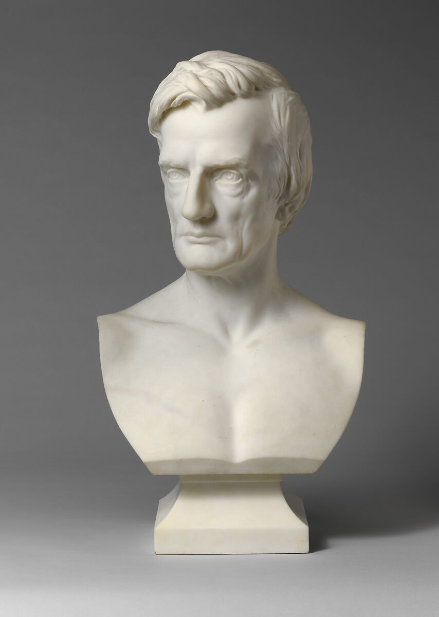 Early in his career, Saint-Gaudens secured commissions for portrait busts of male sitters, which he executed in a hybrid real-ideal style that was popular at the time. This likeness of the prominent attorney William Maxwell Evarts (1818–1901), displayed at the Centennial Exhibition, is a naturalistic bust terminating in a classicizing undraped chest. When Evarts first met Saint-Gaudens in Rome, he was based in Geneva, Switzerland, as the United States’s counsel at the Alabama Claims tribunal, which had been convened to review sanctions against the British for aiding the Confederate cause during the Civil War.