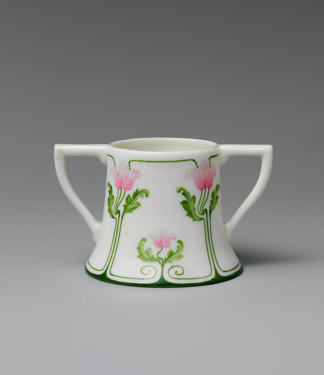 These are probably the hand-painted prototypes for a sugar bowl and coffeepot (1989.263.1a, b) produced as part of a breakfast set. The overglaze decoration, characterized by elongated, whiplash-curved stems, is a rare instance of the Art Nouveau style in American ceramics. The coffeepot’s lid is a reconstruction based on the original design drawing in the Lenox archives.