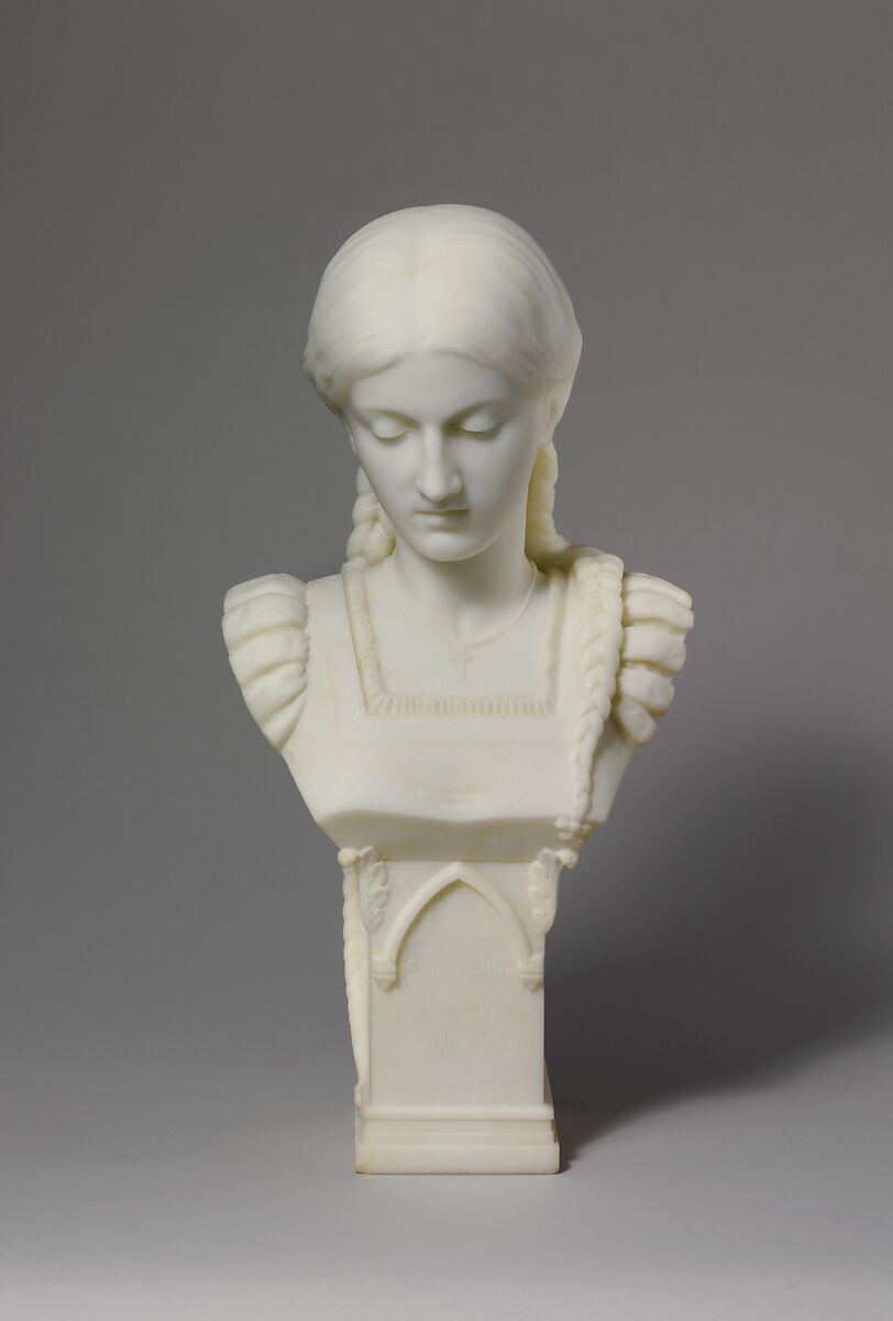 The American singer Eva Rohr was studying opera in Rome when Saint-Gaudens depicted her playing the part of Marguerite in Charles Gounod’s opera Faust. The character was associated with innocence and purity – themes reinforced by her demure downward gaze and the crucifix around her neck. The inscription on the Gothic-style pedestal is an English translation of Marguerite’s first words to Faust, in which she chastely rebukes her impassioned suitor’s offer to accompany her home.