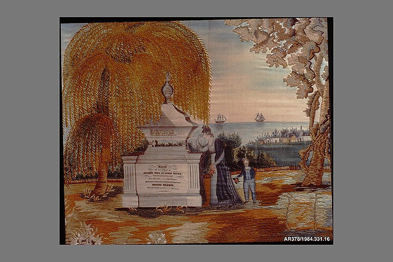 Charlotte Brown has long been thought to be the daughter of Moses Brown, co-founder of Brown University, but genealogical research documents that Brown had no daughters. Although Charlotte’s identity remains uncertain, the composition, materials and techniques correspond closely to other early nineteenth-century Rhode Island silk embroideries. As was the custom, the faces, sky, and sea were painted in watercolor by a professional artist. However, the inscription on the tomb is unusual in that it was printed onto the silk ground fabric with mechanical typeface.