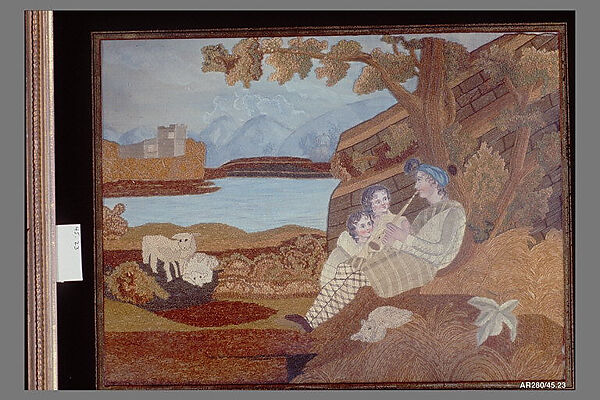 Figures of children rarely appear in eighteenth-century needlework; the prevalent motif was the courting couple. This nineteenth-century needlework picture featuring a shepherd playing his pipe to amuse children rather than to entice his female companion may suggest that the young lady who sewed it was more interested in family than romance.