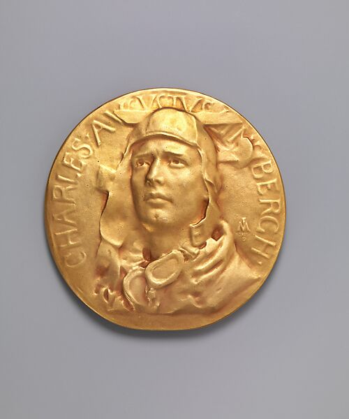 Although MacMonnies earned greatest recognition for his monumental statuary, he supplemented his income with small-scale sculpture and medallic work. This medal was commissioned in 1931 by the Society of Medalists, a New York-based collectors’ organization established the preceding year to support superior medallic efforts. The Society gave artists the freedom to choose their own subject matter, and MacMonnies commemorated Charles Lindbergh’s May 1927 transatlantic flight from New York to Paris. The obverse presents a heroic portrait of the aviator; the reverse portrays a lone eagle battling wind and lightening as the figure of Death retreats in defeat.