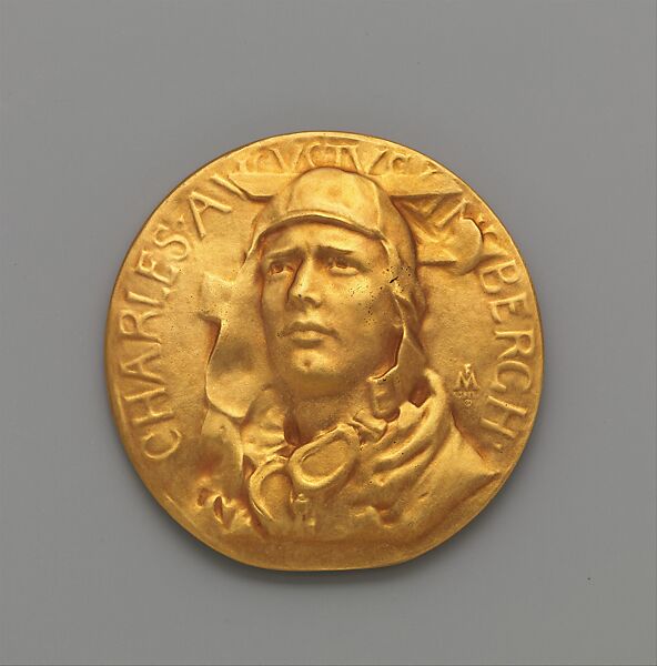 Although MacMonnies earned greatest recognition for his monumental statuary, he supplemented his income with small-scale sculpture and medallic work. This medal was commissioned in 1931 by the Society of Medalists, a New York-based collectors’ organization established the preceding year to support superior medallic efforts. The Society gave artists the freedom to choose their own subject matter, and MacMonnies commemorated Charles Lindbergh’s May 1927 transatlantic flight from New York to Paris. The obverse presents a heroic portrait of the aviator; the reverse portrays a lone eagle battling wind and lightening as the figure of Death retreats in defeat.