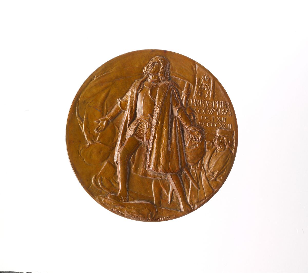 Saint-Gaudens, who served as an advisor for the Chicago World’s Columbian Exposition sculptural program, accepted the commission for the official award medal. He had completed his design for the medal by the time of the fair’s closing in November 1893. His design for the obverse met ready acceptance. It shows Columbus making landfall in the Americas. At the lower right are three male figures, one bearing an unfurling banner, and above them are the symbolic Pillars of Hercules with the three Spanish caravels and the inscription plvs vltra. His concept for the reverse, however—a nude male youth representing the Spirit of America—was deemed improper by United States Senate Quadro-Centennial Committee. Two variant designs with the figure’s genitals covered and a third with a wreath-encircled eagle and inscription were also rejected. In the end, Saint-Gaudens’s obverse was muled with a design for the reverse by Charles E. Barber, longtime chief engraver at the United States Mint.
