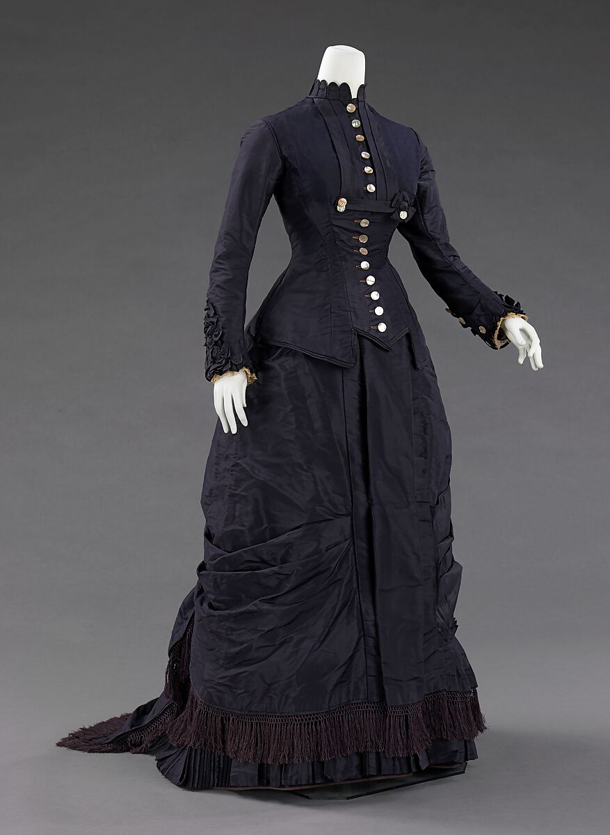 The bustle silhouette, although primarily associated with the second half of the 19th century, originated in earlier fashions as a simple bump at the back of the dress, such as with late 17th-early 18th century mantuas and late 18th- early 19th century Empire dresses. The full-blown bustle silhouette had its first Victorian appearance in the late 1860s, which started as fullness in skirts moving to the back of the dress. This fullness was drawn up in ties for walking that created a fashionable puff. This trendsetting puff expanded and was then built up with supports from a variety of different things such as horsehair, metal hoops and down. Styles of this period were often taken from historical inspiration and covered in various types of trim and lace. Accessories were petite and allowed for the focus on the large elaborate gowns. Around 1874, the style altered and the skirts began to hug the thighs in the front while the bustle at the back was reduced to a natural flow from the waist to the train. This period was marked by darker colors, asymmetrical drapery, oversize accessories and elongated forms created by full-length coats. Near the beginning of the 1880s the trends altered once again to include the bustle, this time it would reach its maximum potential with some skirts having the appearance of a full shelf at the back. The dense textiles preferred were covered in trimming, beadwork, puffs and bows to visually elevate them further. The feminine silhouette continued like this through 1889 before the skirts began to reduce and make way for the S-curve silhouette.