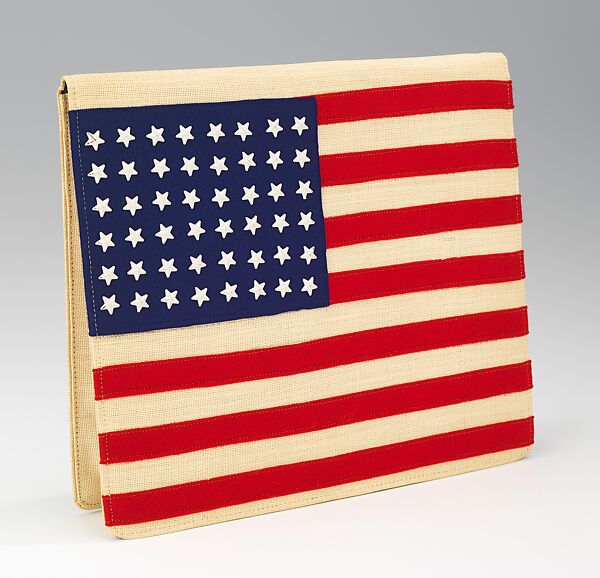 During World War II, women on the home front wore red, white and blue garments as a means of showing support for the troops and the nation at war, but this jaunty clutch makes an even more obvious statement. A woman carrying this bag proudly advertised her patriotic sentiments. Probably a novelty item, the bag is comprised of a surprising and creative combination of materials -- straw, felt and plastic -- assembled to create a vivid symbol of American pride. The flag itself, which covers the entire oversized flap, has only forty-eight stars, an indication that the bag was made prior to 1959, when Alaska became the forty-ninth state.