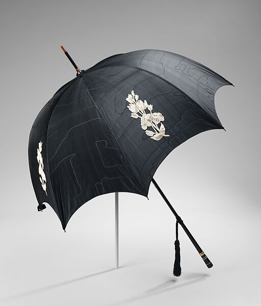 This parasol is an example of the combination of fine jewelry work as well as fine craftsmanship for umbrella/parasol making. This was either a presentation piece or a gift, as indicated by the inscription on the ring. A very expensive item, the lace appliqués are handmade. The combination of black and white was quite prevalent in the post-1908 period and this fine accessory marks the beginning of that trend. The provenance adds extra interest as it was donated by the Mary Flagler Cary Charitable Trust established in 1938.