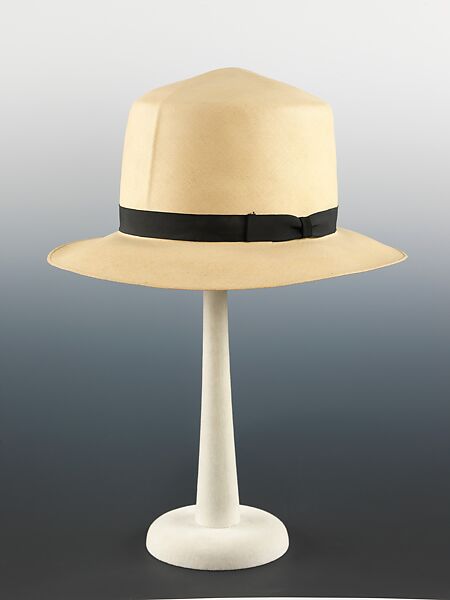 Introduced to American men in the early part of the 20th century, the panama hat survives as a classic style still worn to combat the heat of summer or of the tropics. The hat's characteristic material, a light-colored fine flexible straw, allows it to be rolled and packed, making it ideal for travel. Adopted by workers building the Panama Canal (1904-1914), the style became associated with that country, rather than Ecuador, where it originated. High-quality hats are traditionally made in the town of Montechristi, as the label of this hat attests. When Theodore Roosevelt donned a panama hat during his landmark visit to the Canal in 1906, he contributed to the popularity of the style for American men.
