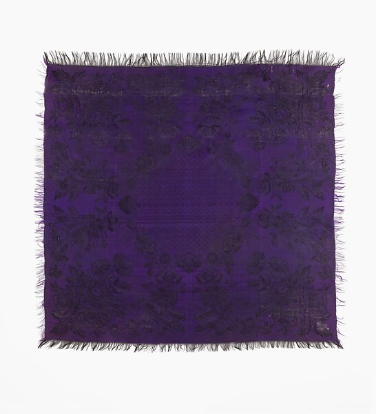 While the specific origins of this scarf have not been identified, the floral patterning is typical of traditional European folk costume. The beautiful, saturated color is achieved only with silk dyeing. It was given to the collection by Millicent Rogers, who not only amassed a notable collection of haute couture garments, she also collected folkloric clothing and accessories for her own use.