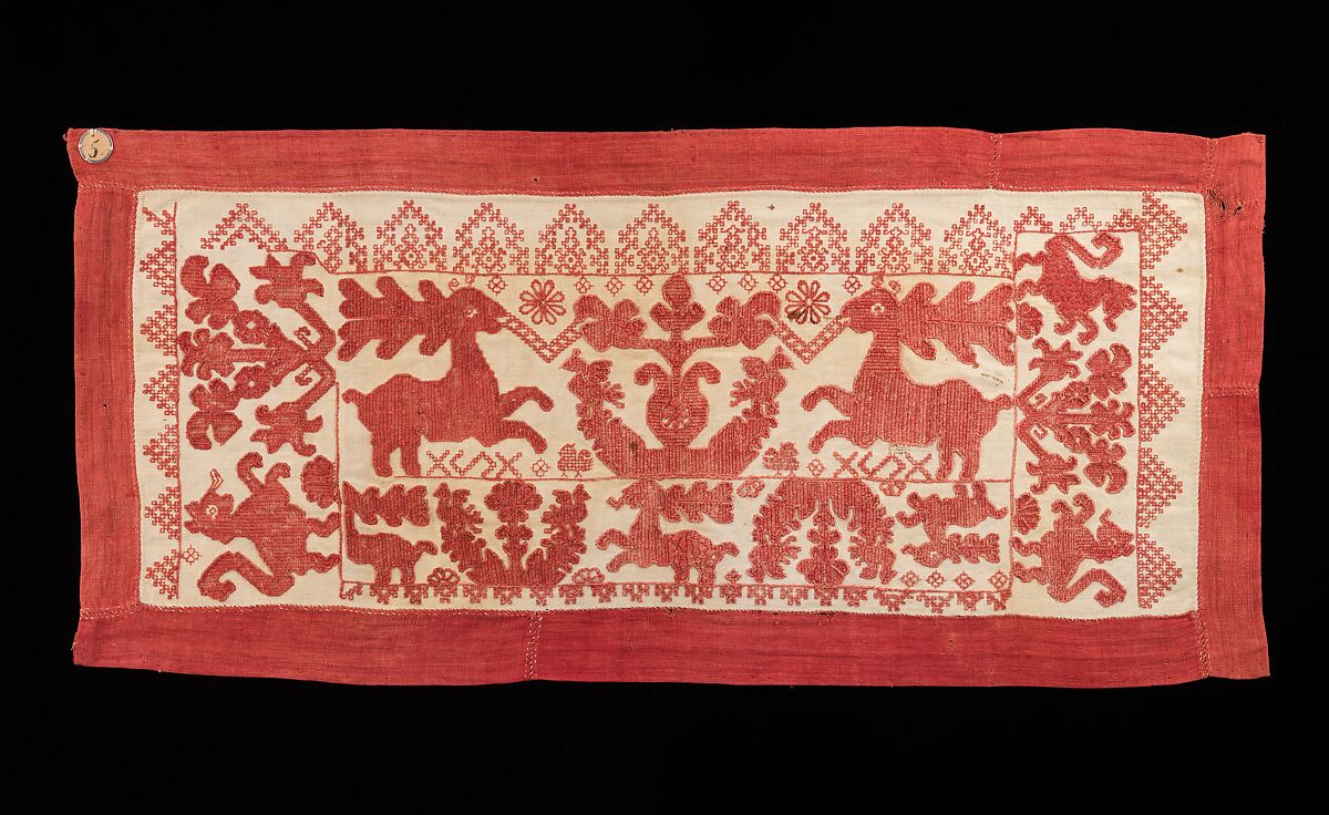 This object is from the collection of Natalia de Shabelsky (1841-1905), a Russian noblewoman compelled to preserve what she perceived as the vanishing folk art traditions of her native country. Traveling extensively throughout Great Russia, she collected many fine examples of textile art of the wealthy peasant class. From the 1870s until moving to France in 1902, Shabelsky amassed a large collection of intricately embroidered hand-woven household textiles and opulent festival garments with rich decoration and elaborate motifs. The Brooklyn Museum holdings include many fine examples including the majority of the garments. Portions of Shabelsky's collection are also housed at the Museum of Fine Arts, Boston, the Cleveland Art Museum, and the Russian Museum of Ethnography in St. Petersburg.