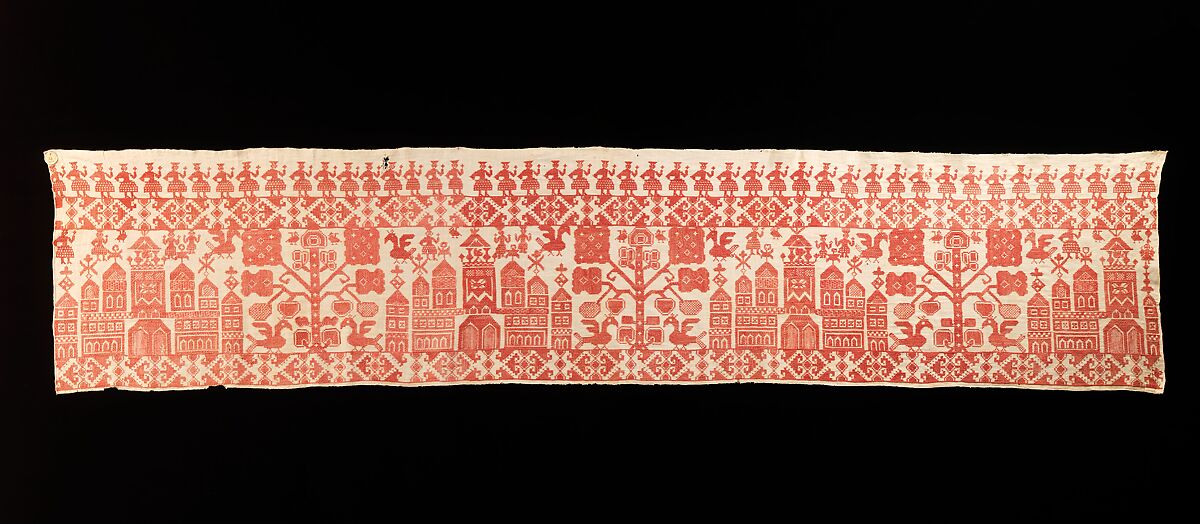 Due to the size of this bed curtain border, it likely belonged to a wealthier family of the peasant class. The level of detail is remarkable, representing what were probably known buildings to the maker. The ground is dense with motifs, including the common peacocks as well as figures that are most likely representative of the daughter goddess. The daughter goddess often accompanies the great goddess, represented here by the tree of life.