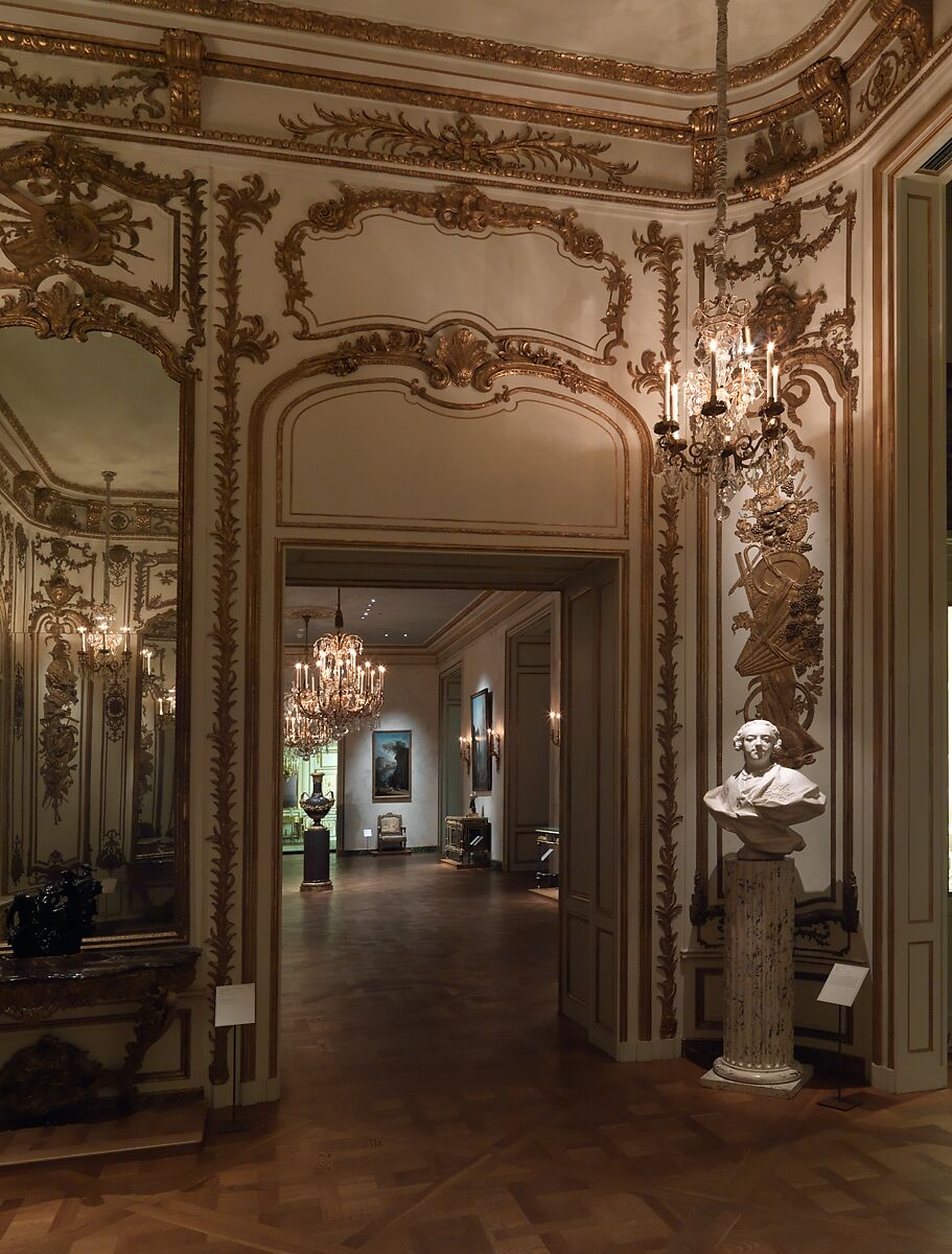The original location of this early eighteenth-century paneling has not been identified, although it was once thought to have come from the Château de Marly. The boiserie was sold several times during the nineteenth century and belonged at one point to the French history painter Joseph-Désiré Court (1797–1865), who reportedly had acquired them from a Parisian cabinetmaker and dealer in antique furniture and woodwork called Monbro, probably Georges-Alphonse-Bonifacio (1807–1884). Court’s effects were auctioned off in 1866 following his death. At that point the paneling still included six overdoor panels instead of the Museum’s single pair, carved with trophies of music, now placed above the two side mirrors, indicating that the boiserie was originally made for a larger room.