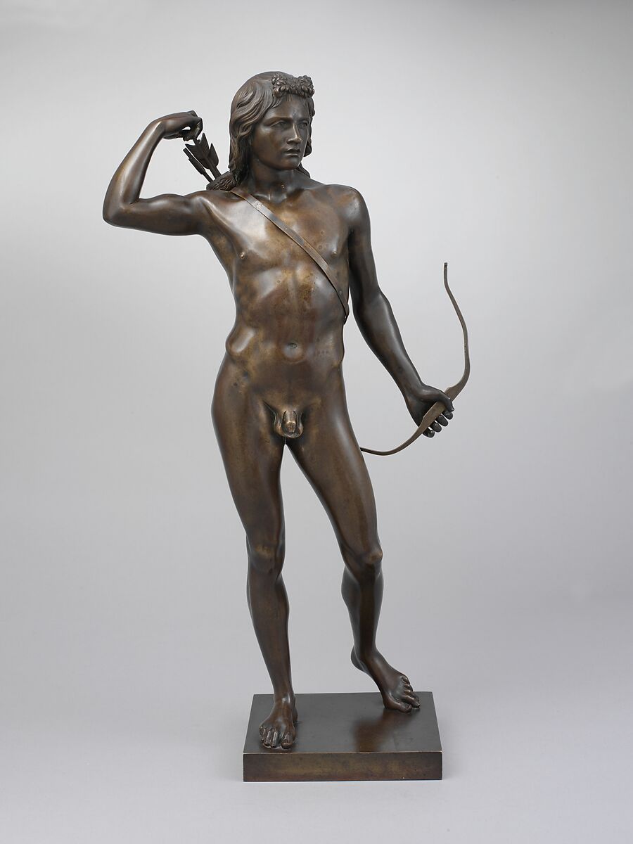 In 1848, Brown earned a commission for a statuette representing an Indigenous subject from the American-Art Union, a New York organization that distributed art to subscribers by annual lottery. To prepare for Choosing of the Arrow, he traveled to Michigan’s Mackinac Island in Lake Huron. His visit coincided with a gathering of Chippewa and Ottawa peoples, and he spent much of his time sketching them. The resulting sculpture, an idealized male nude reaching to draw an arrow from the quiver strapped to his back, reveals Brown’s exacting attention to detail in the subtle handling of the ribcage and the ornamental topknot.