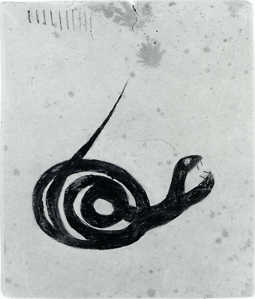 Born into enslavement in rural Alabama, Traylor—one of the most significant Black artists of the twentieth century—experienced first-hand dramatic historical change in the United States, including enslavement, emancipation, Reconstruction, Jim Crow segregation, and the Great Migration. Around 1939, at the age of 86, Traylor began spending his days drawing the life around him in the capitol-city of Montgomery, Alabama, as well as revisiting events from his own past. Working with an innate sense of design and storytelling, his radically distinctive renderings are striking in their disregard for spatial depth and proportion. By the time of his death in 1949, Traylor had created over 1,000 pencil drawings and gouache paintings on pieces of found cardboard. The artist's powerful imagery records his unique perspective on African American life in the early 20th-century urban South. This bold representation of a coiled black snake—fangs bared and tail erect—positioned slightly off-center on the sheet, is one of Traylor’s most compelling animal subjects.