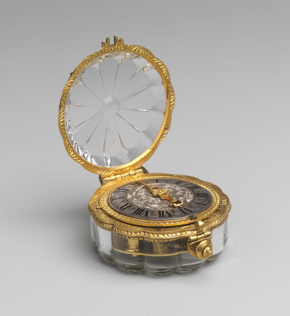 The Museum’s Arlaud watch is housed in a gilded-brass case that is set with eleven separate pieces of faceted rock crystal. A twelfth piece made of cross-shaped glass appears to be a skillful replacement for the original back cover of the case. There is no casemaker’s signature or mark, and his identity will probably never be known, but the small pieces of rock crystal and their separation by the metal frame of the case might suggest an early date of about 1620–30 for the object.