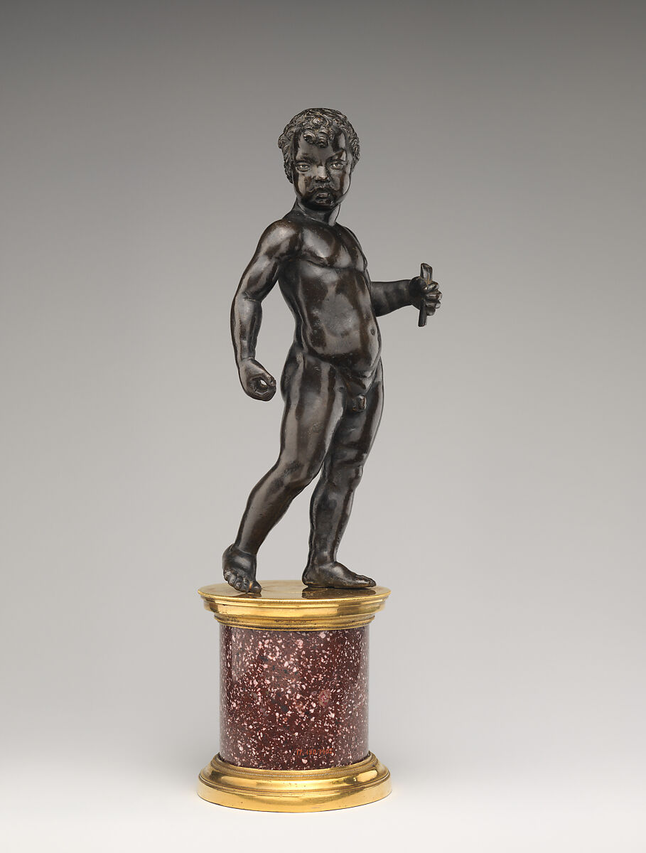 At least six replicas of the Houston bronze exist. In descending order of quality and vitality, the Houston bronze, then The Met’s, were followed by indifferent casts in the V&A, the Kunsthistorisches Museum, two in the Capodimonte, and two that have passed through the trade.[4] The indiscernible objects held by the boy in the Horne drawing and the bronze boys in Houston, New York, and Naples somewhat resemble folds of cloth. They were replaced by spoons in the hands of the London and Vienna children. The silvering of our boy’s eyes is well preserved, and his pupils are drilled, lending the figure some distinction, but those of the Houston boy were once silvered, too, and remains of gilding have been found, now only detectable by X-ray fluorescence spectroscopy. Further, the Houston and New York examples were cast indirectly and yield precisely the same dimensions.[5] Richard Stone has suggested that, while not necessarily cast at precisely the same time or even by the same hand, these two statuettes are among the earliest, if not the earliest, indirectly cast bronzes of the Italian Renaissance.[6] They were modeled and chased very differently, though, our bronze being far less taut and muscular and with a much sleeker surface.