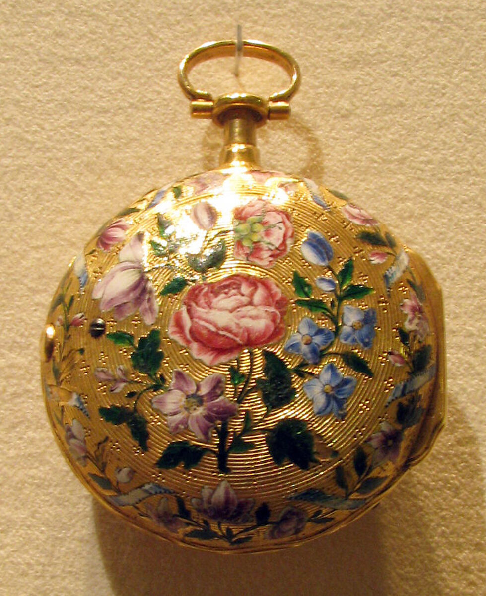 Julien Le Roy, probably the most inventive clockmaker in eighteenth century France, was appointed clockmaker to Louis XV (1710–1774), an honor that allowed him a workshop in the Louvre. The movement of the watch strikes hours and quarters on the back of the case instead of on a bell. This type of repeater, called a dumb repeater, allowed the user to tell the time unobtrusively by counting the vibrations of the case. The style of the case, with its beautiful opaque-enameled flowers that seem to float on an engraved gold ground, was fashionable among Parisian makers of watchcases and gold boxes about the middle of the eighteenth century.