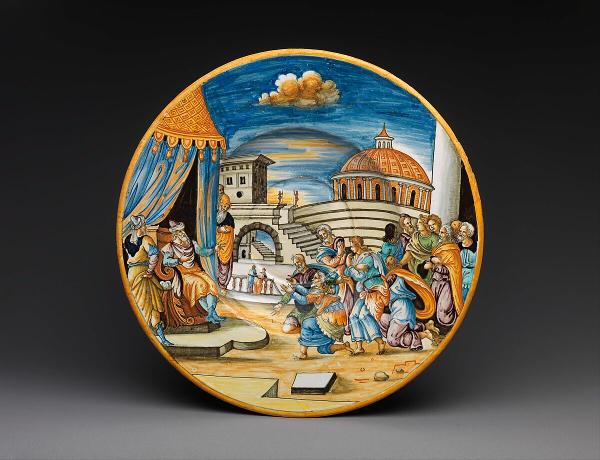 Having sold him into slavery as a child, Joseph’s brothers leave famine-plagued Canaan for Egypt. Here, they kneel before the governor (not recognizing him as Joseph) to ask permission to purchase corn; Joseph responds by accusing them of spying (Genesis 42:1–16). The composition was adapted from a woodcut by Bernard Salomon (ca. 1508?–ca. 1561).